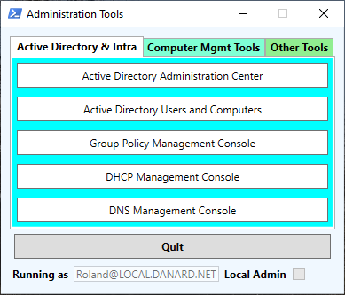 $toolsList = @( [PSCustomObject]@{ Name = "DSAC_EXE" Label = "Active Directory Administration Center" FilePath = $env:SystemRoot + "\System32\dsac.exe" Parameters = "" TabName = "ADInfra" } [PSCustomObject]@{ Name = "REGEDIT_EXE" Label = "Registry Editor" FilePath = $env:SystemRoot + "\regedit.exe" Parameters = "/s" TabName = "ComputerMgmt" } [PSCustomObject]@{ Name = "CHROME_EXE" Label = "Google Chrome" FilePath = $env:ProgramFiles + "\Google\Chrome\Application\Chrome.exe" Parameters = "https://danard.net" TabName = "Other" } }